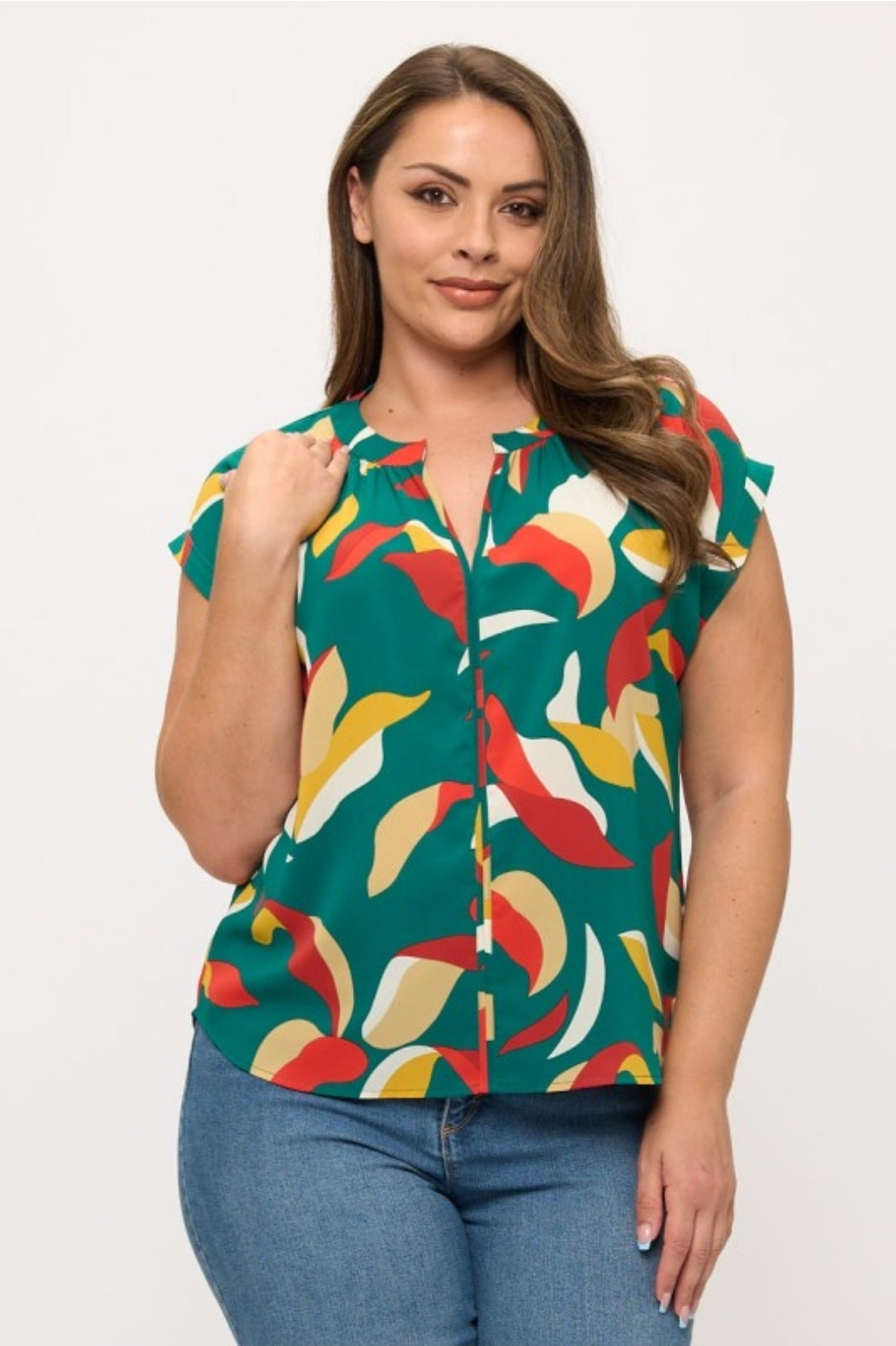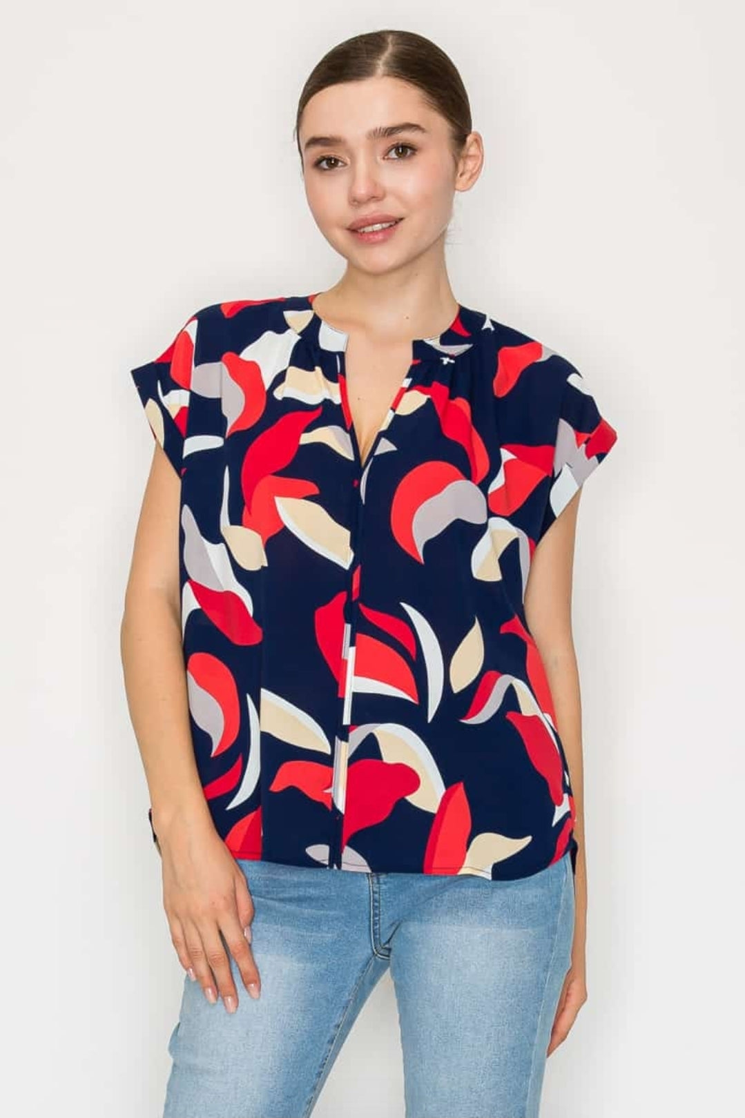 Designed with cap sleeves, a flattering V-notch neckline, and a concealed button placket, it offers both comfort and polish for everyday wear. The lightweight woven fabric ensures breathability, while the relaxed fit drapes beautifully for a flattering look on all body types.