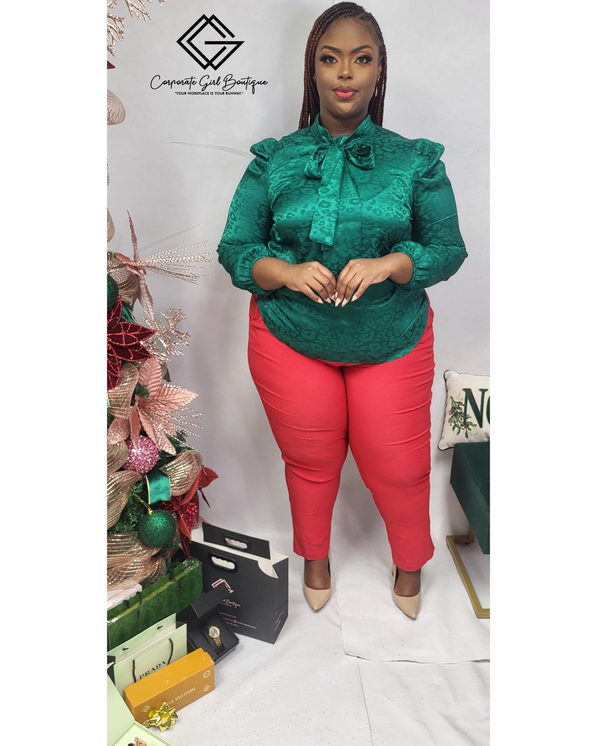 Step into the season in timeless elegance with this stunning emerald green jacquard blouse. Designed with a subtle textured pattern that catches the light beautifully, this top features a statement bow-tie neckline, soft puff shoulders, and a refined long-sleeve silhouette — perfect for elevating any workwear or holiday look. The satin-like finish gives it a luxurious feel while still remaining comfortable and breathable for all-day wear.