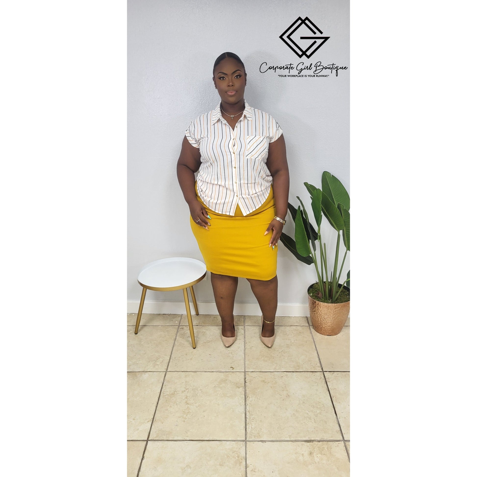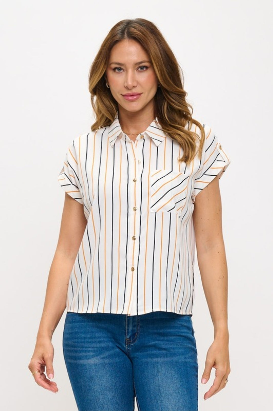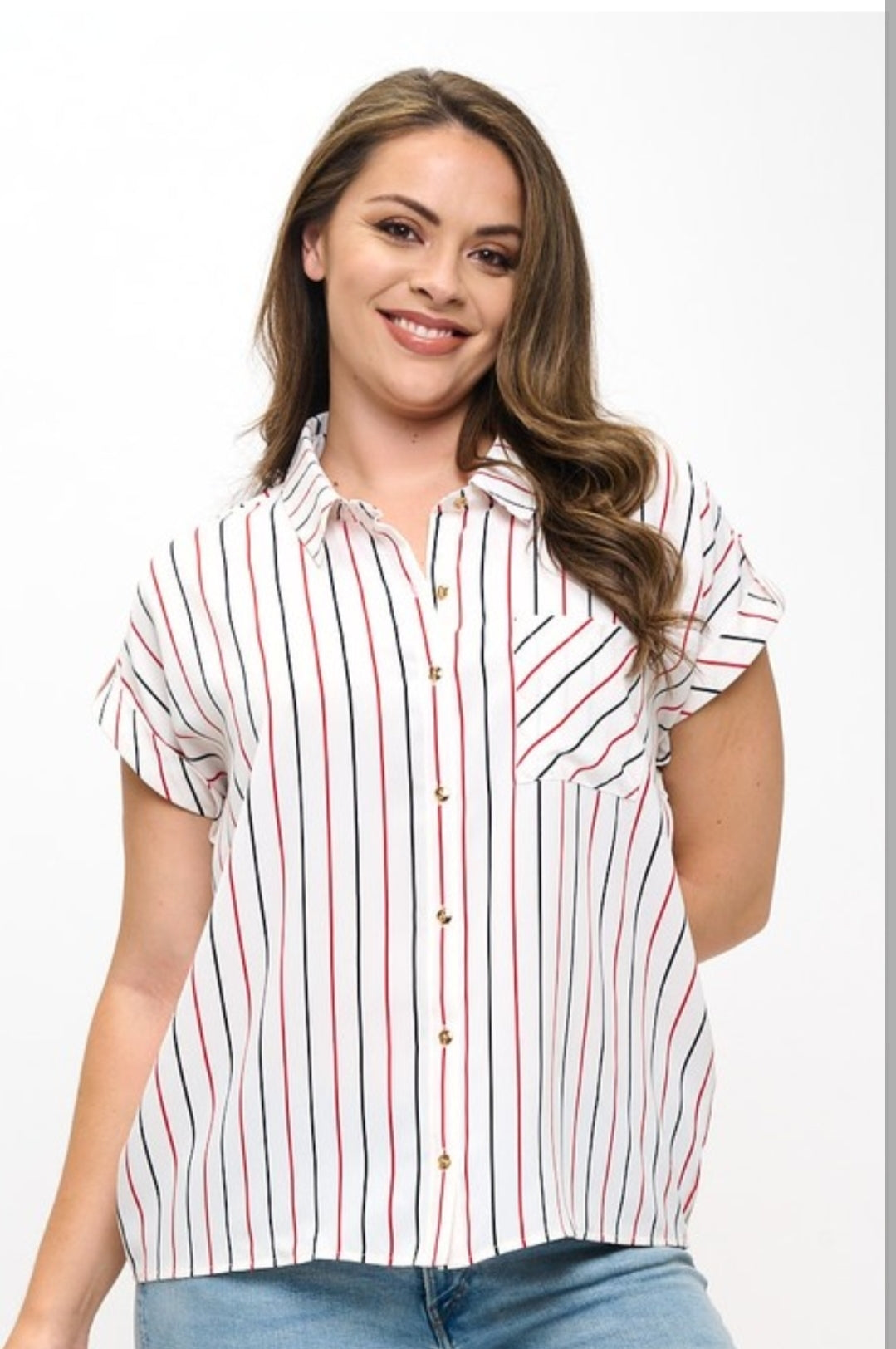 Clean lines meet casual elegance in the Metro Stripe Button-Up Blouse. Featuring a crisp white base with vertical red and black pinstripes, this short-sleeve blouse adds a refined touch to your everyday wardrobe. The relaxed silhouette, classic collar, and chest pocket bring effortless polish, while the rolled sleeves and gold-tone buttons keep it fresh and modern. Perfect for dressing up with slacks or down with denim, it’s your new staple for workdays and weekends alike.