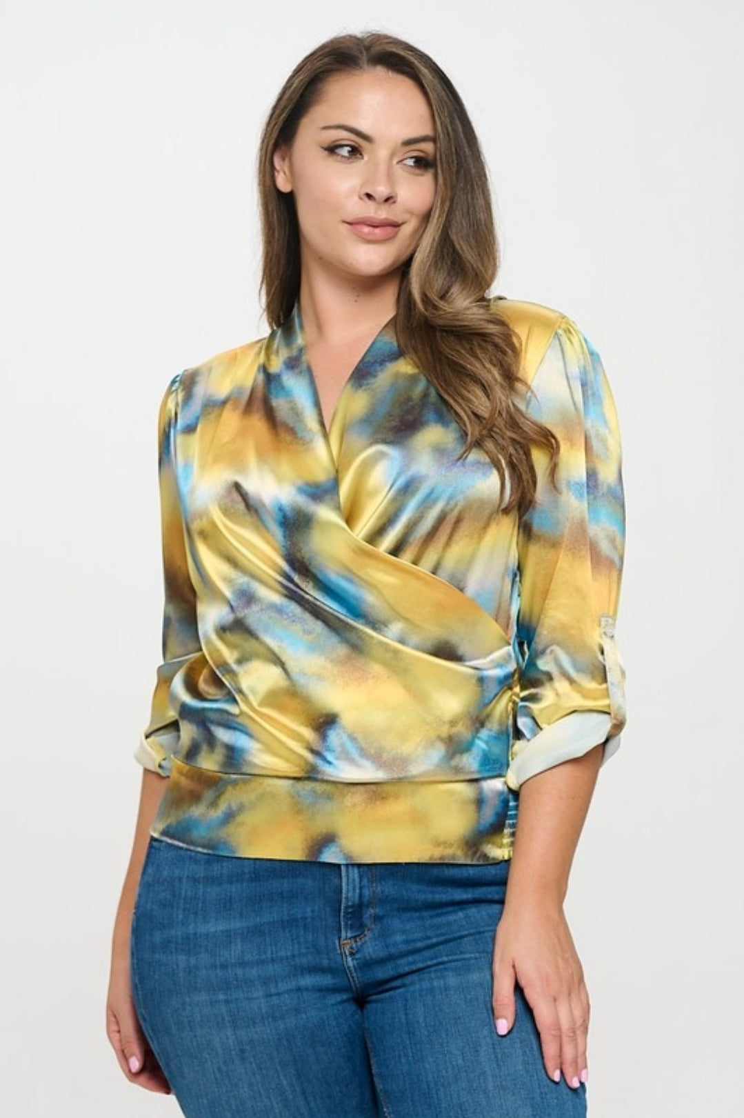 Radiate elegance and sophistication with the Golden Horizon Watercolor Wrap Blouse. This striking piece features a rich, abstract watercolor print in shades of golden yellow, sky blue, and deep brown, evoking the warmth of a sunset and the serenity of flowing water.